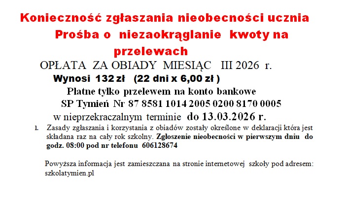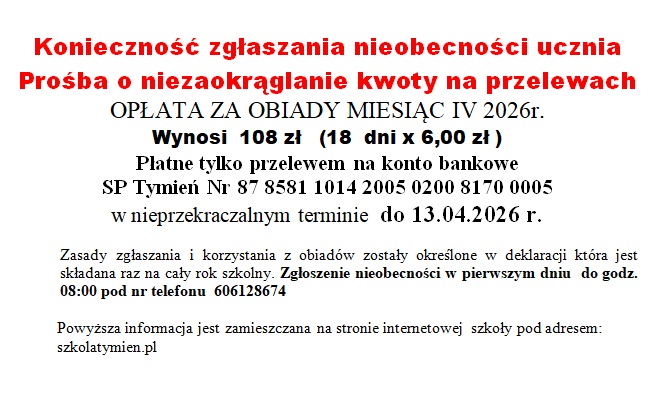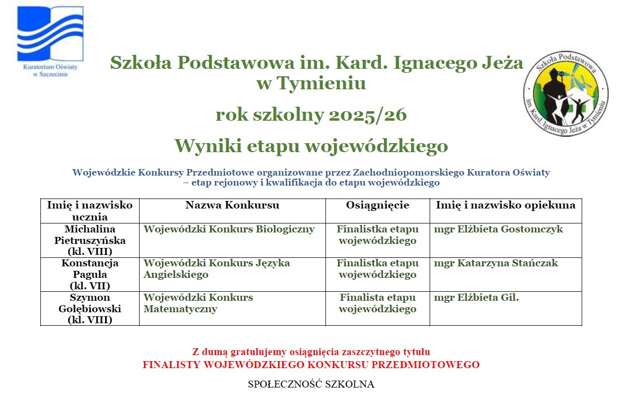 Szkoły Podstawowej im. Kard. Ignacego Jeża w Tymieniu na rok szkolny 2026/27